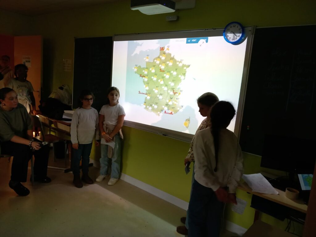 Après nous nous sommes réunis dans la salle verte pour le journal télévisé de l’école filmé!Des élèves étaient présentateurs et d’autres ont présenté leur reportage sur les sujets suivants: la météo, le top 14, le roi des rois, la montagne pelée, une recette de cuisine, une activité de Noël, les resto du cœur, saint Léon, Téléthon, Nettoyons la nature, 11 novembre, le chocolat, livre à offrir, sondage sur la nouvelle cour.