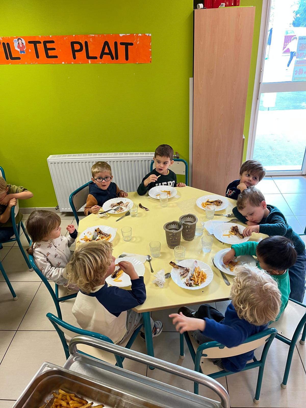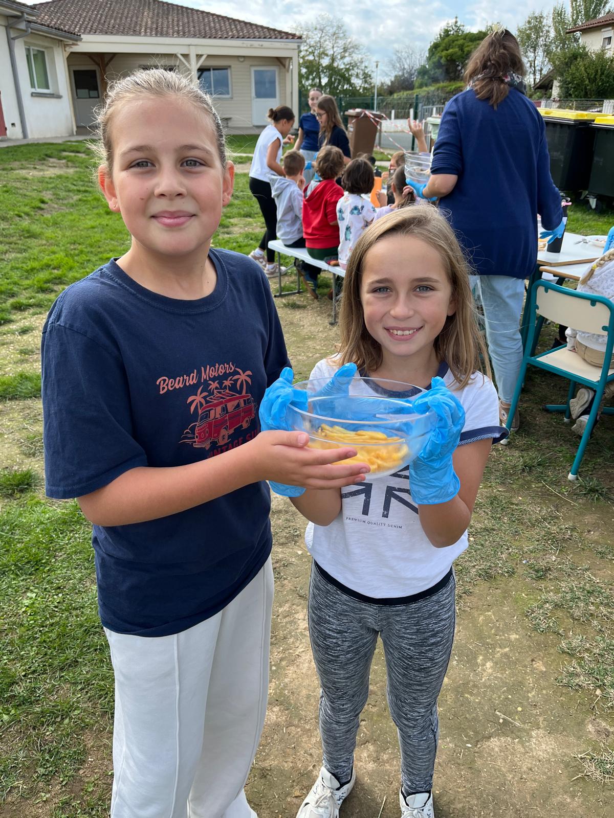 Pendant cette journée, nous avons installé les tables dans le pré le matin, pour la barbecue party. Nous avons mangé des pilons de poulet avec des frites. En dessert, nous avions soit une mousse au chocolat, un flan au chocolat ou une compote.