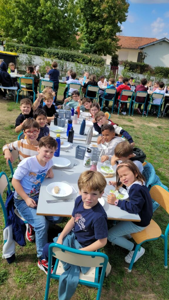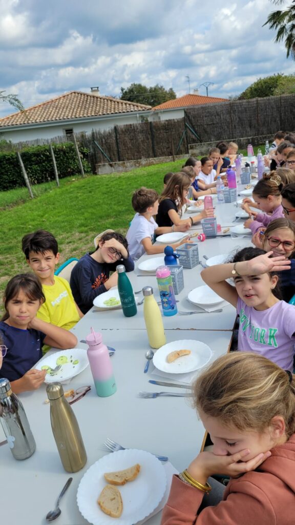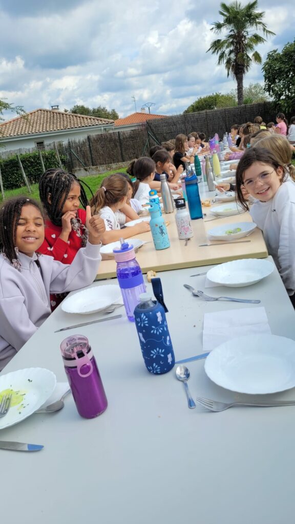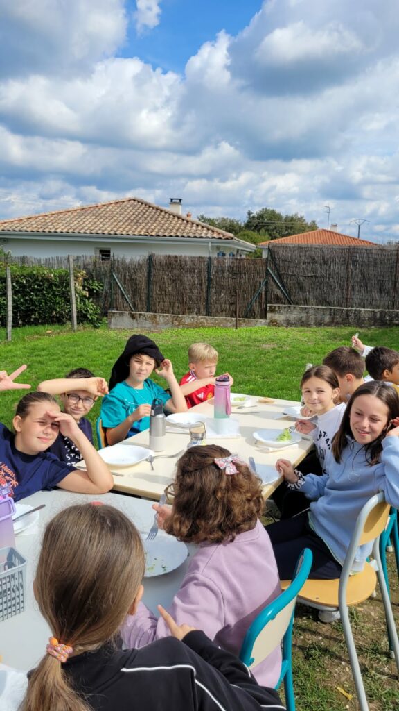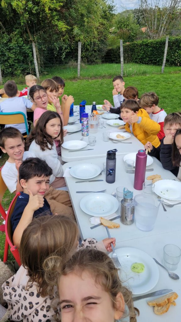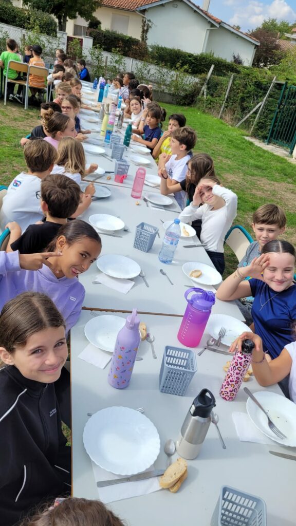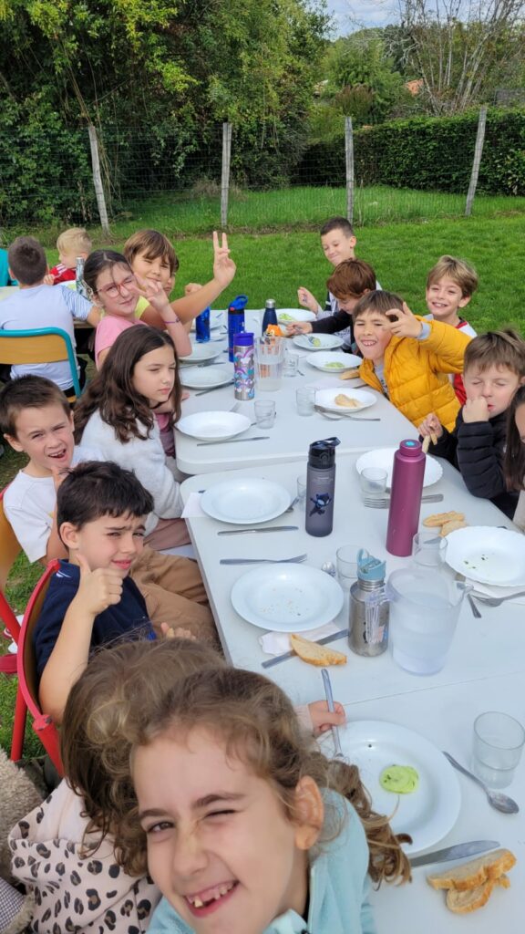 Pendant cette journée, nous avons installé les tables dans le pré le matin, pour la barbecue party. Nous avons mangé des pilons de poulet avec des frites. En dessert, nous avions soit une mousse au chocolat, un flan au chocolat ou une compote.