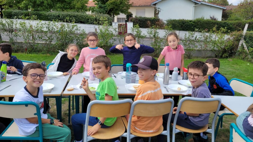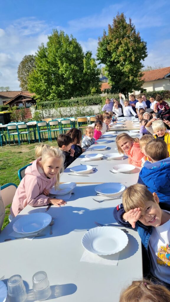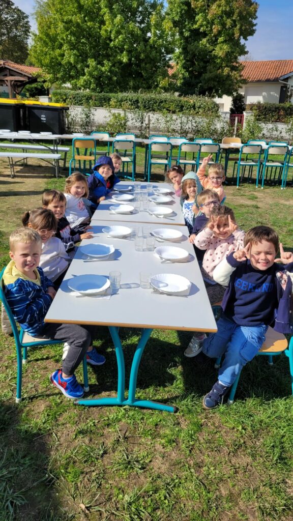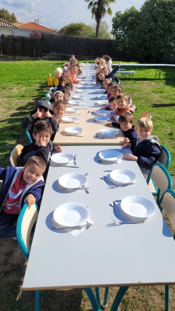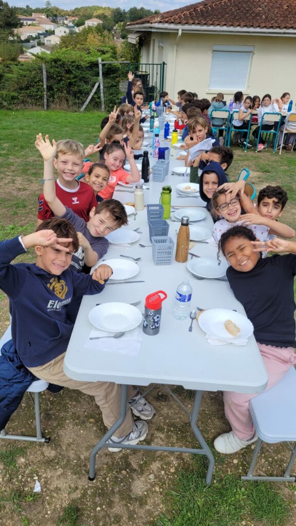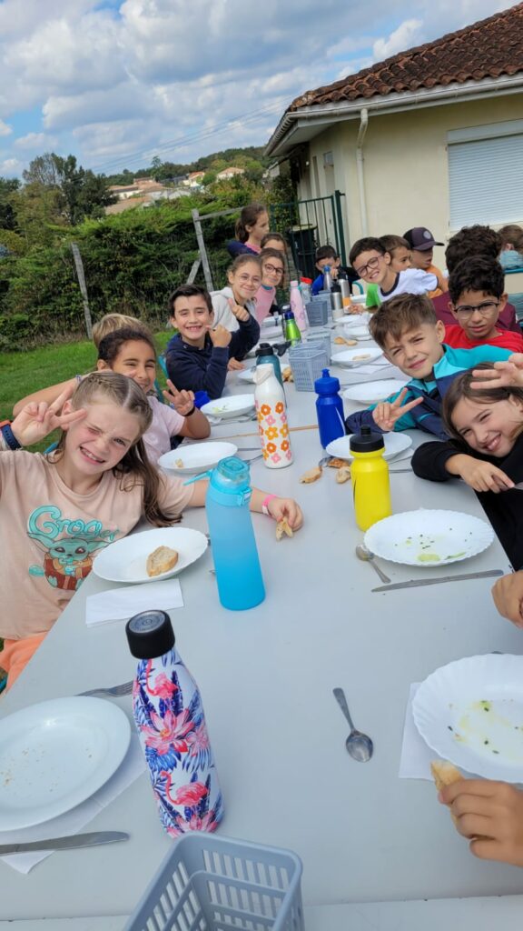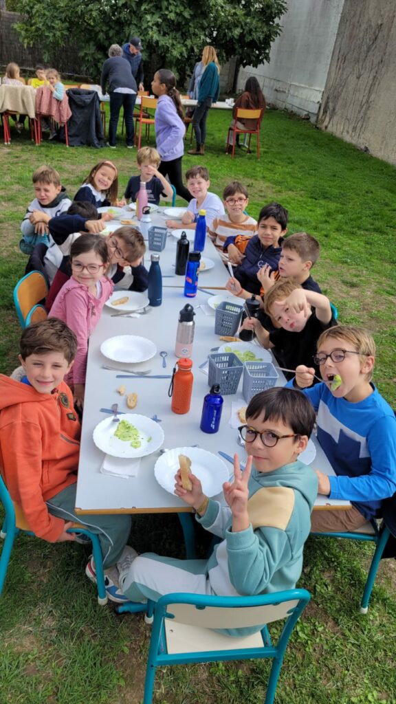 Pendant cette journée, nous avons installé les tables dans le pré le matin, pour la barbecue party. Nous avons mangé des pilons de poulet avec des frites. En dessert, nous avions soit une mousse au chocolat, un flan au chocolat ou une compote.