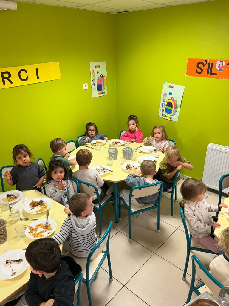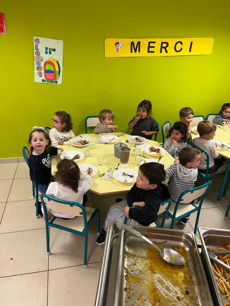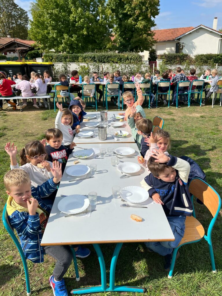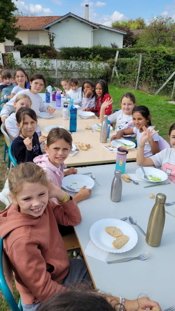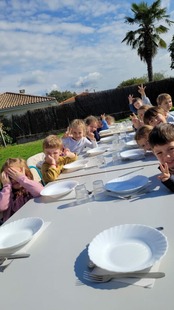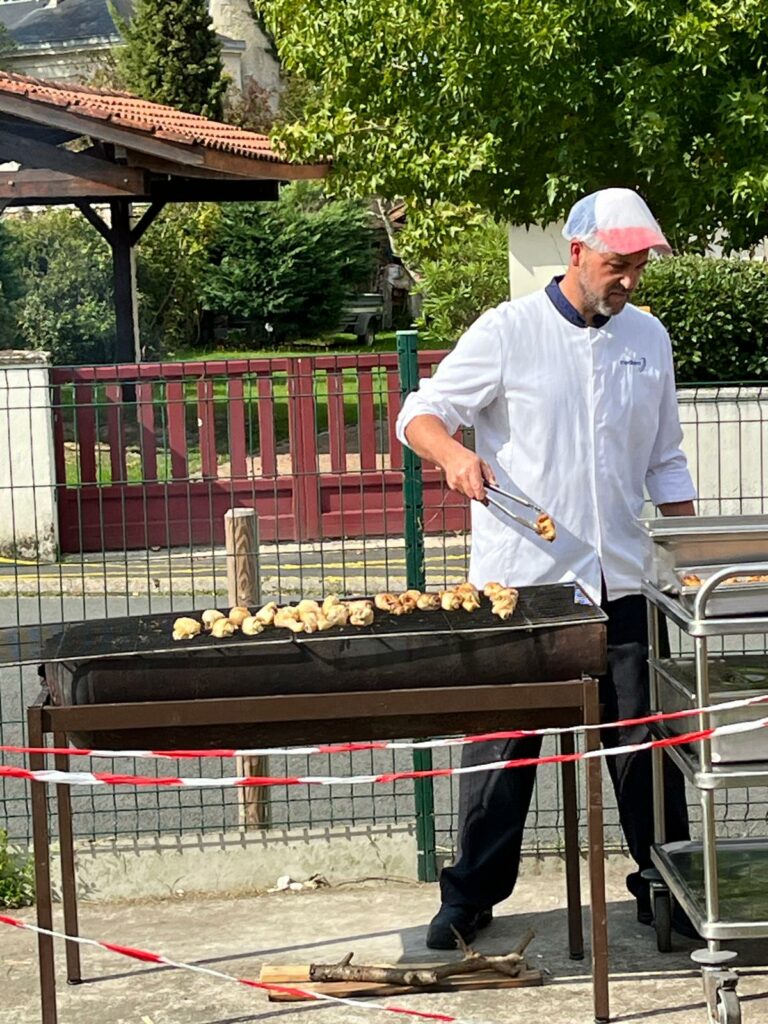 Pendant cette journée, nous avons installé les tables dans le pré le matin, pour la barbecue party. Nous avons mangé des pilons de poulet avec des frites. En dessert, nous avions soit une mousse au chocolat, un flan au chocolat ou une compote.