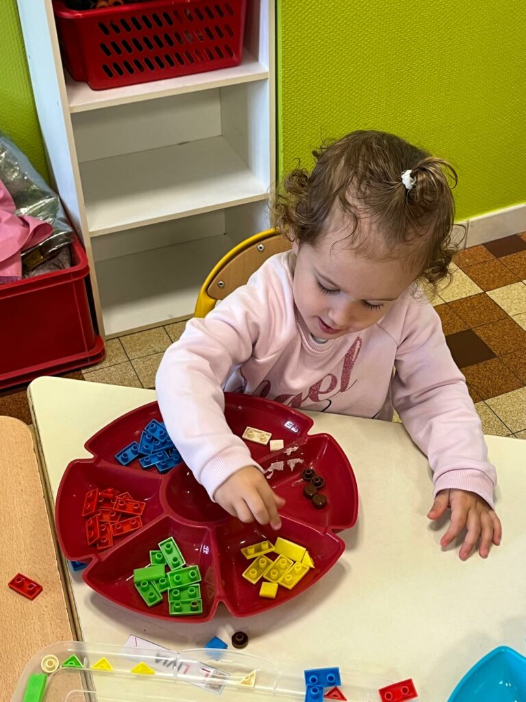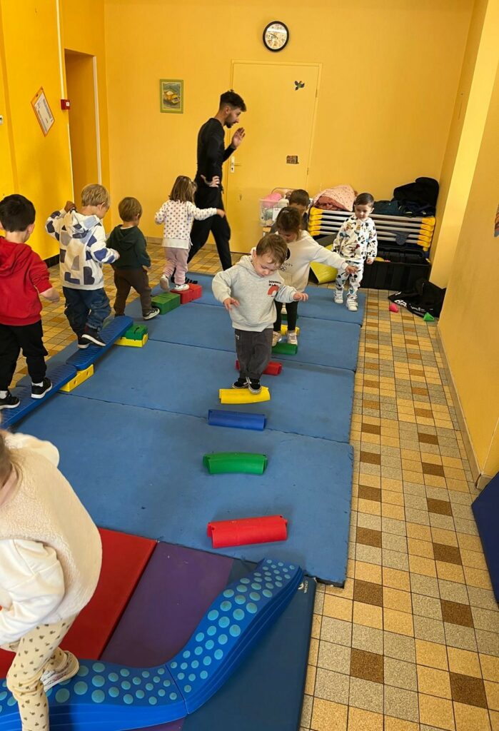 Les PS/TPS ont fait des ateliers de motricité avec Corentin. Ils marchaient sur un parcours.