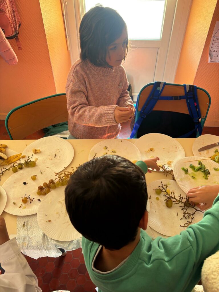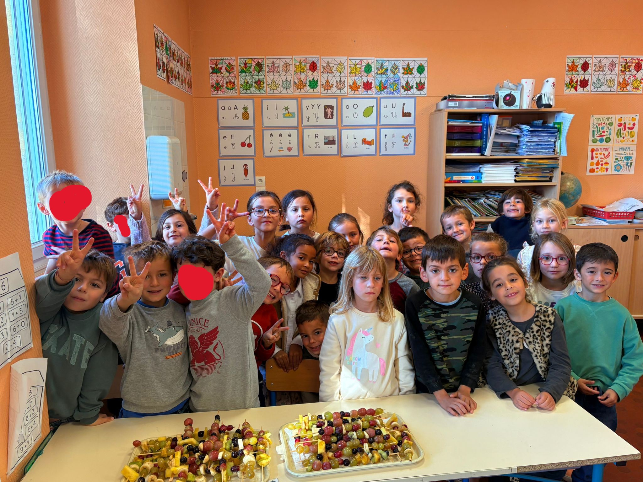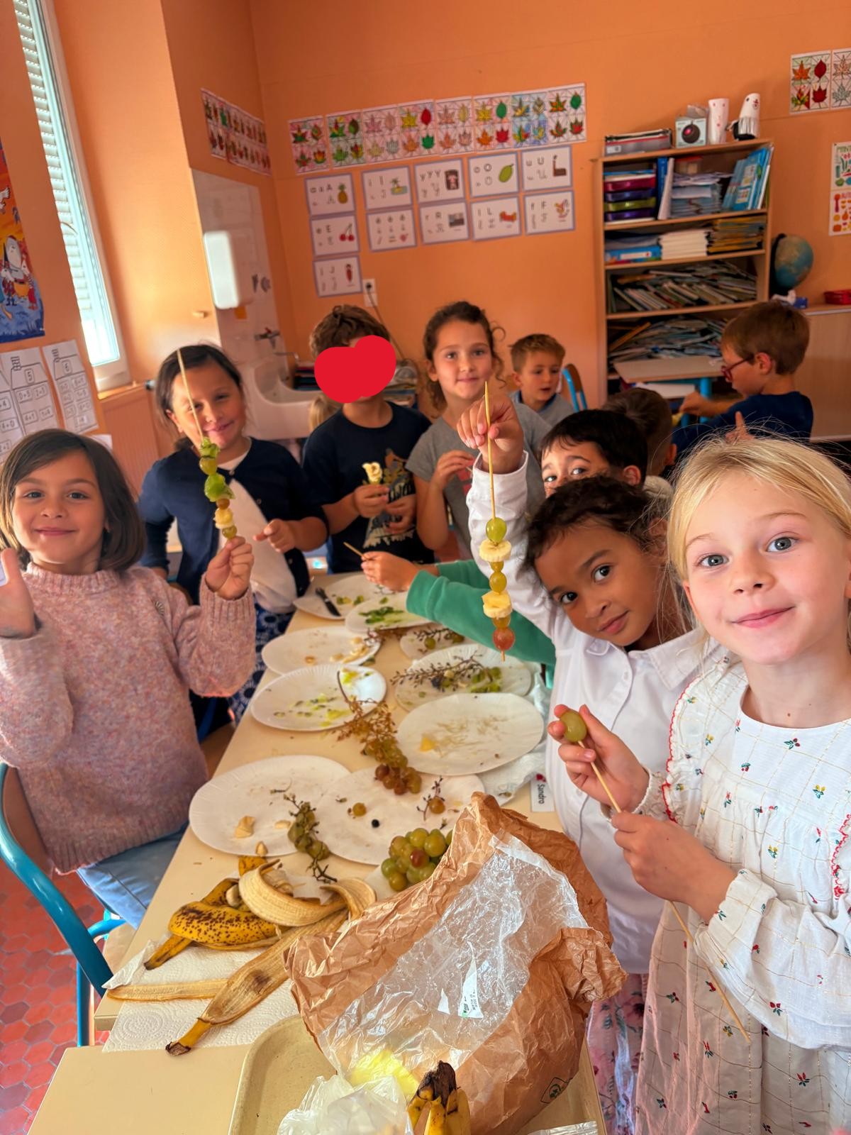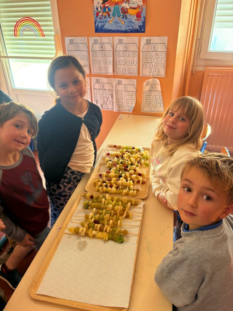 Les CP ont fait des brochettes de fruits, il y avait de la pomme, du kiwi, de l’ananas, de la banane et du raisin.