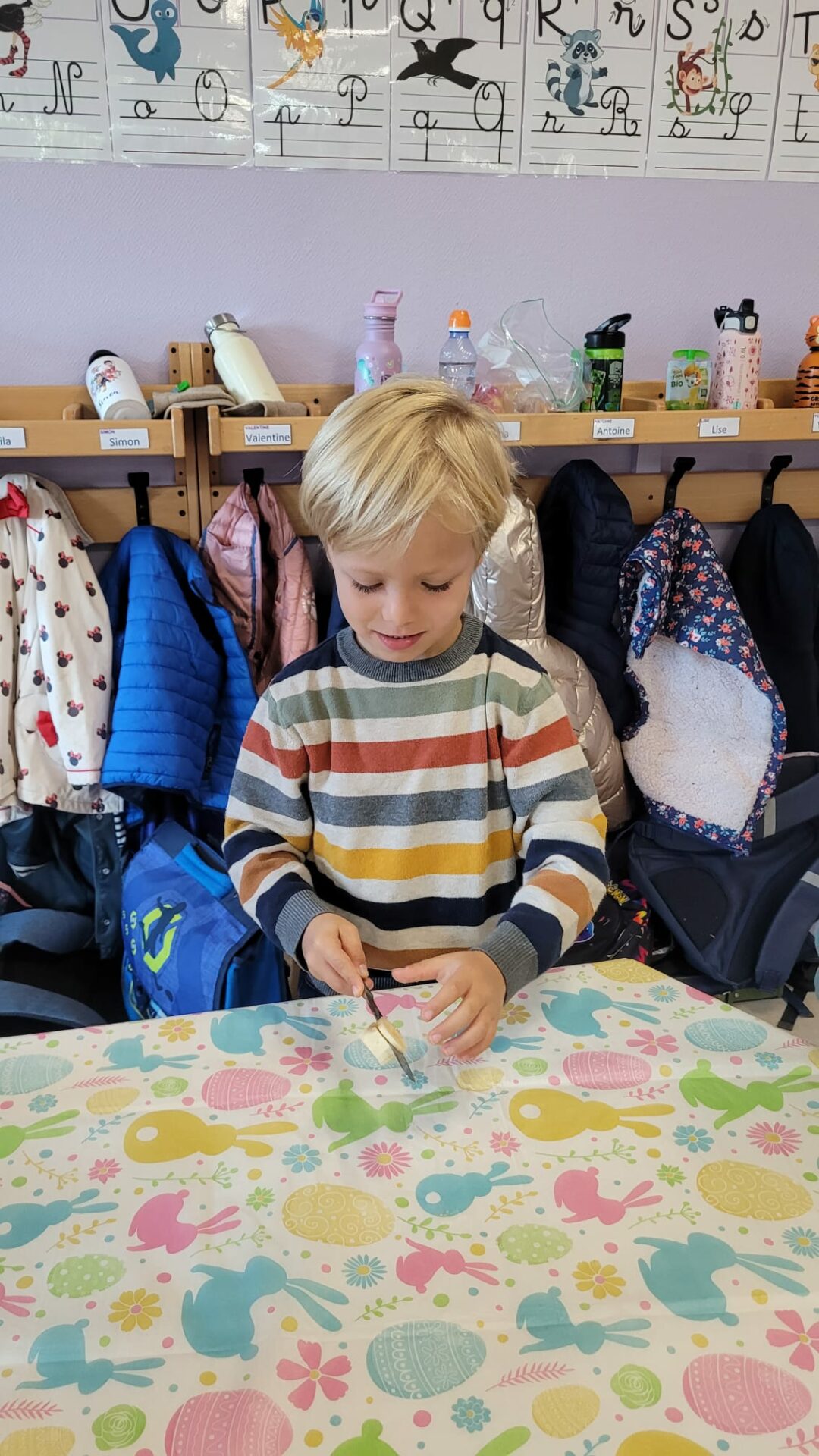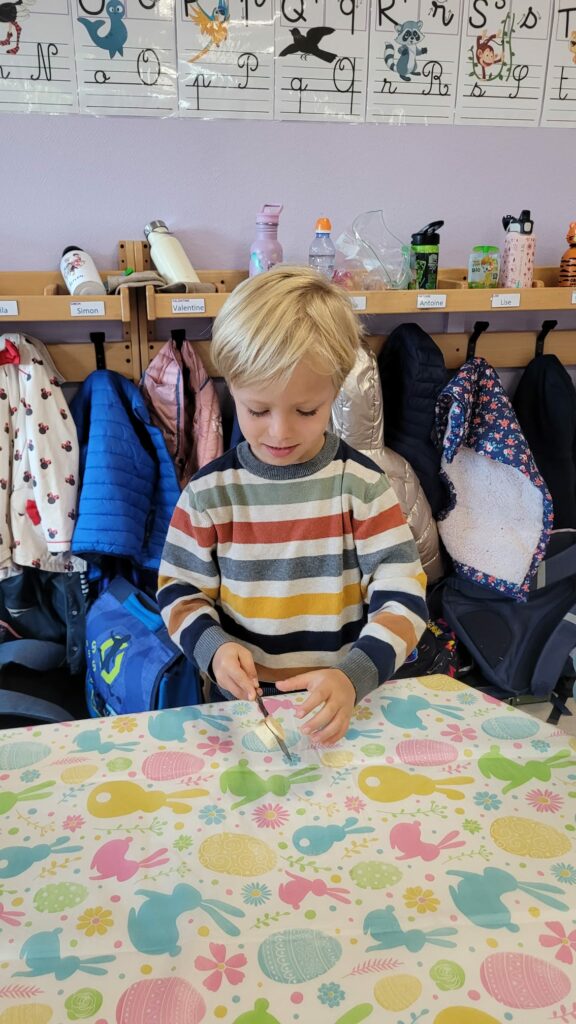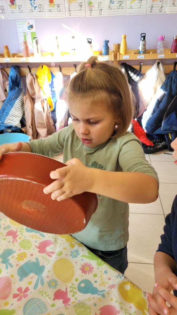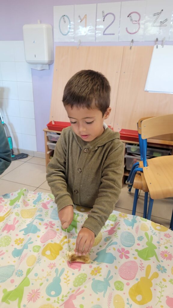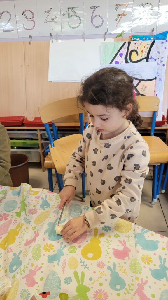 Les CP ont fait des brochettes de fruits, il y avait de la pomme, du kiwi, de l’ananas, de la banane et du raisin.